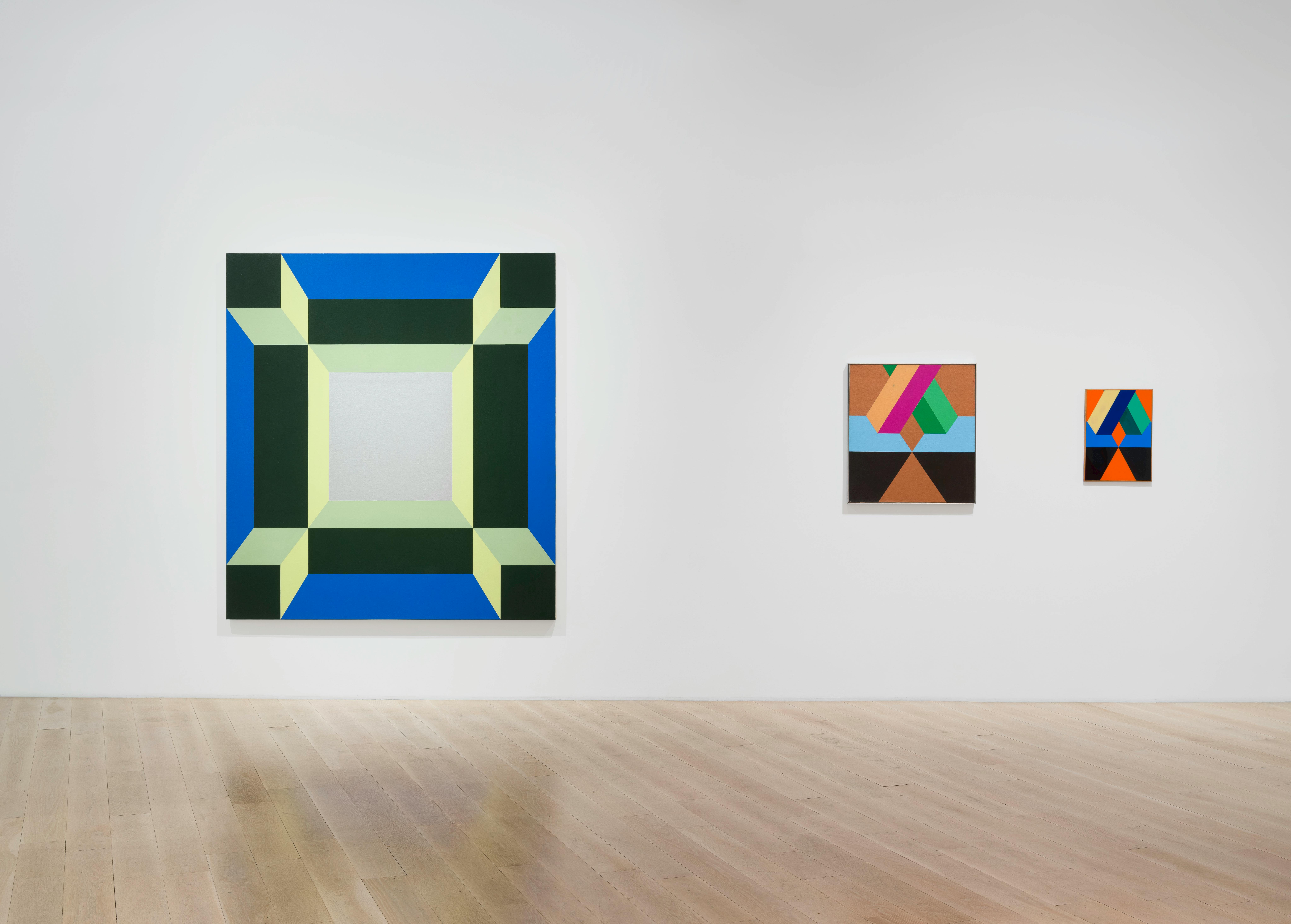 In 1969, Schapiro began working with the computer science department at the University of California, San Diego, where she continued developing the geometric form featured in Big Ox. Here, Schapiro used early digital technologies to create drawings of interlocking rectangular and rounded volumes, which she would translate into paintings. In her “Mylar Series” (1970–71) enamel and tape compositions appear to float on monochromatic, reflective mylar surfaces. “I saw the machine as an aid to thought,” Schapiro later reflected. “The [computer] paintings were a culmination to me of a total self-assertion begun in Ox.” In the exhibition, Big Ox is accompanied by a series of large-scale paintings that show three-dimensional forms rendered in hues of red or yellow. Through distorted perspective and dramatic angles, the shapes appear monumental in scale.